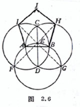 [已知边长作正五边形] 已知AB等于边长.以A,B为圆心,AB为半径画两圆交于C,D,连接CD.以D为圆心,AB为半径画圆,交CD于E,交A圆于F,交B圆于G,连接FE,GE,并延长交B,A圆于H,I.分别以H,I为圆心,AB为半径画弧交于J,连接JI,IA,BH,HJ,连同AB即为所求正五边形(图2.6).