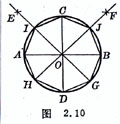 [已知外接圆作正十边形] 过圆心O作互相垂直的直径AB,CD,以OB为直径画圆E,连接EC交E圆于F.以CF为半径在圆周上顺次截段,并连接各点,即为所求正十边形(图2.11).