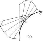 The limit position of the intersection of two adjacent planes in the ridge plane family is called the feature line of the family, and the envelope of the feature line (if it exists) is called the ridge line of the family, which divides the envelope surface into two leaves, with the ridge Lines as "sharp bobbins" of surfaces (figure ( d ) )