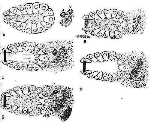图2-75 A:正常胰腺。图解代表正常胰腺腺泡细胞群,箭头示胰酶流入导管。 A(动脉)、V(静脉)、L(淋巴管)在间质内。 B:水肿型胰腺炎胰酶进入间质。 C、D:出血型胰腺炎 胰酶增多,血管渗出,叶间渗出骤增,静脉扩张、郁血、红细胞入淋巴循环,循环血量减少,内脏动脉收缩。 E:坏死型胰腺炎 动脉痉挛,静脉血栓形成、淋巴管被红细胞堵塞,血供 不足、坏死。