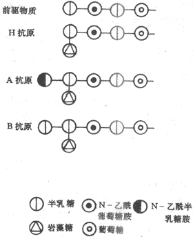 上述ABO系统各种血型抗原的特异必理决定于糖蛋白上所含的糖链。这些糖链都是由少数糖基所组成的寡糖链(oligosaccharide)。这些寡糖链都暴露在红细胞的表面,图3-9示意了ABO系统中H、A和B抗原的寡糖链结构差异。