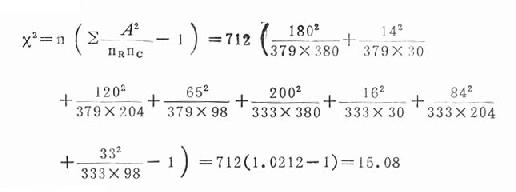 | 四、行×列表的卡方检验(x[SB]2[/SB]testfor R×C table)适用于两个组以上的率或百分比差别的显着性检验。其检验步骤与上述相同,简单计算公式如下: